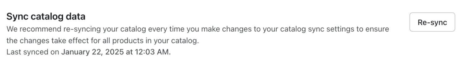 - Na seção denominada Sync catalog data (Sincronizar dados do catálogo), clique em Re-sync (Re-sincronizar). Seu catálogo começará a ser sincronizado novamente.