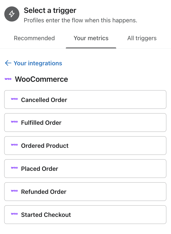 - Crie dois fluxos de winback separados: um acionado pelo evento Placed Order do WooCommerce (conforme listado acima) e outro acionado pelo evento Placed Order do Buy with Prime para contabilizar os clientes que fizeram o pedido original com o Buy with Prime. Para seu fluxo de retorno do Buy with Prime, leia Como criar um fluxo de retorno para o Amazon Buy with Prime.