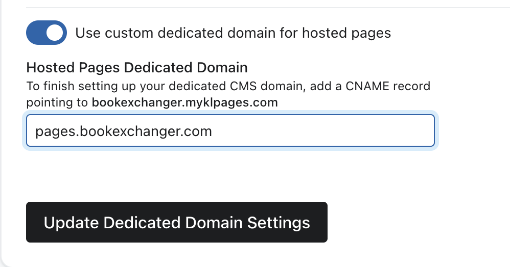 - Esse nome de host servirá como um alias para o domínio yourbusiness.myklpages.com fornecido na seção Content Management Settings (Configurações de gerenciamento de conteúdo ) da sua conta. Para o exemplo do The Book Exchanger, a configuração pode ser semelhante: