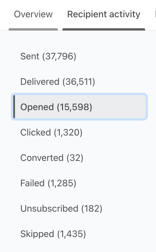 Lembre-se de que os eventos abertos dependem das configurações do dispositivo, e nem todos os Destinatários os reportarão. Use-os como uma parte de sua estratégia de engajamento, juntamente com cliques e conversões.