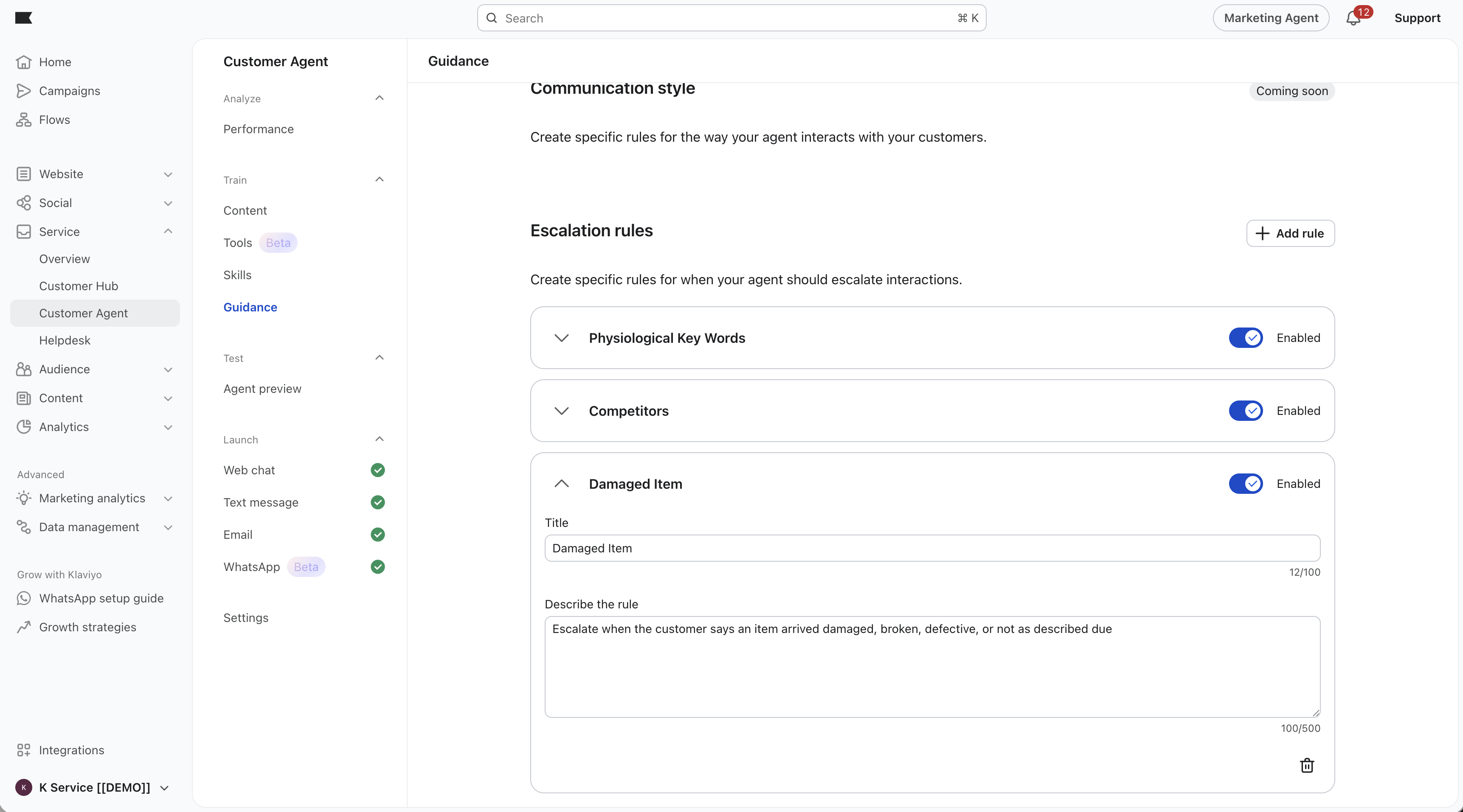 O resumo de sua marca e as regras de escalonamento são armazenados em sua conta Klaviyo e são usados exclusivamente para configurar seu Customer Agent. O conteúdo de orientação não é compartilhado entre contas.
