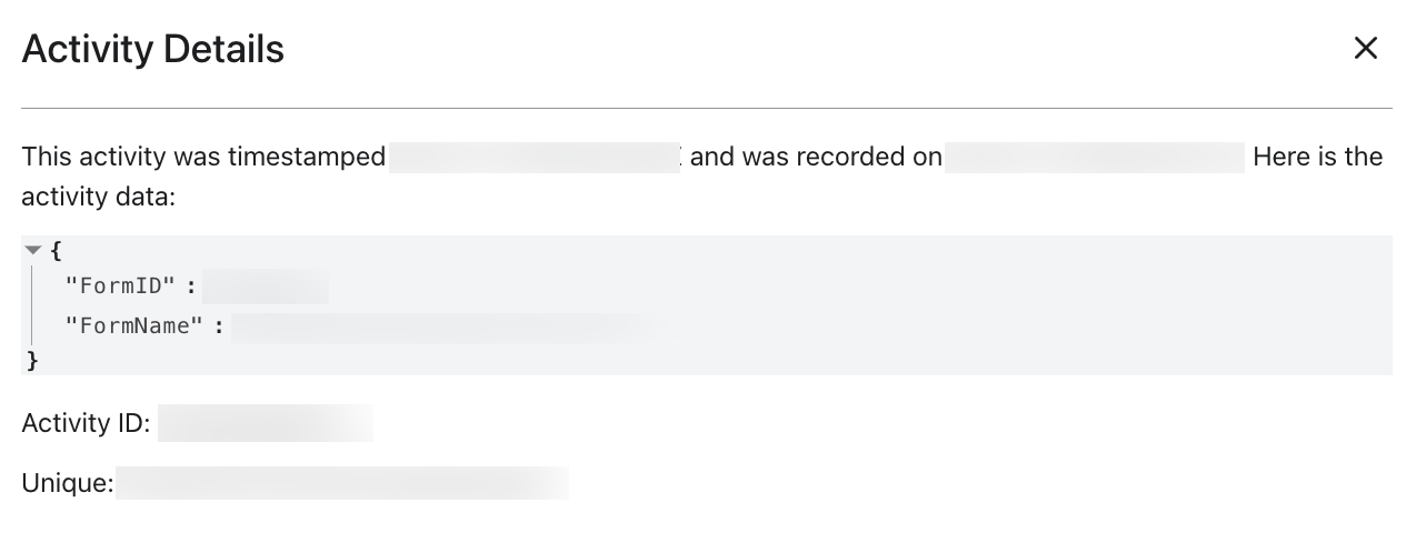 När någon fyller i ett formulär kommer en Filled Out Form-händelse från Typeform att spåras i personens profil i Klaviyo. Om du expanderar för att visa detaljerna för en händelse hittar du formulärets ID och namn.