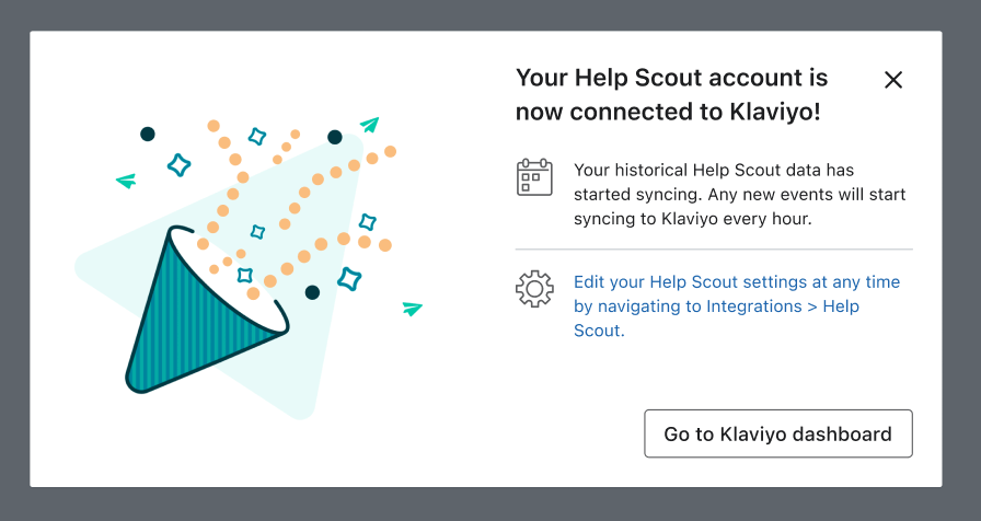 Lär dig hur du integrerar Help Scout med Klaviyo för att synkronisera importera mättal om dina Help Scout -konversationer till ditt Klaviyo -konto, vilket kan hjälpa till med riktade meddelanden. Klaviyo's inbyggda Help Scout integrationer stöder fullt ut Help Scout's Mailbox API 2.0. Integrationsprogrammet Help Scout synkroniseras med Klaviyo varje timme.