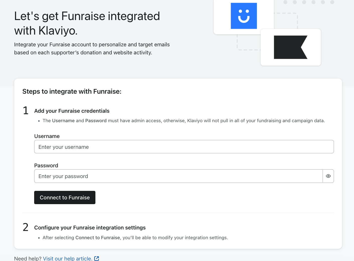 - Ange ditt användarnamn och lösenord och klicka sedan på Connect to Funraise. Observera att e-post och lösenord måste ha admin-åtkomst, annars kommer Klaviyo inte att dra in alla dina insamlingar och kampanj data.