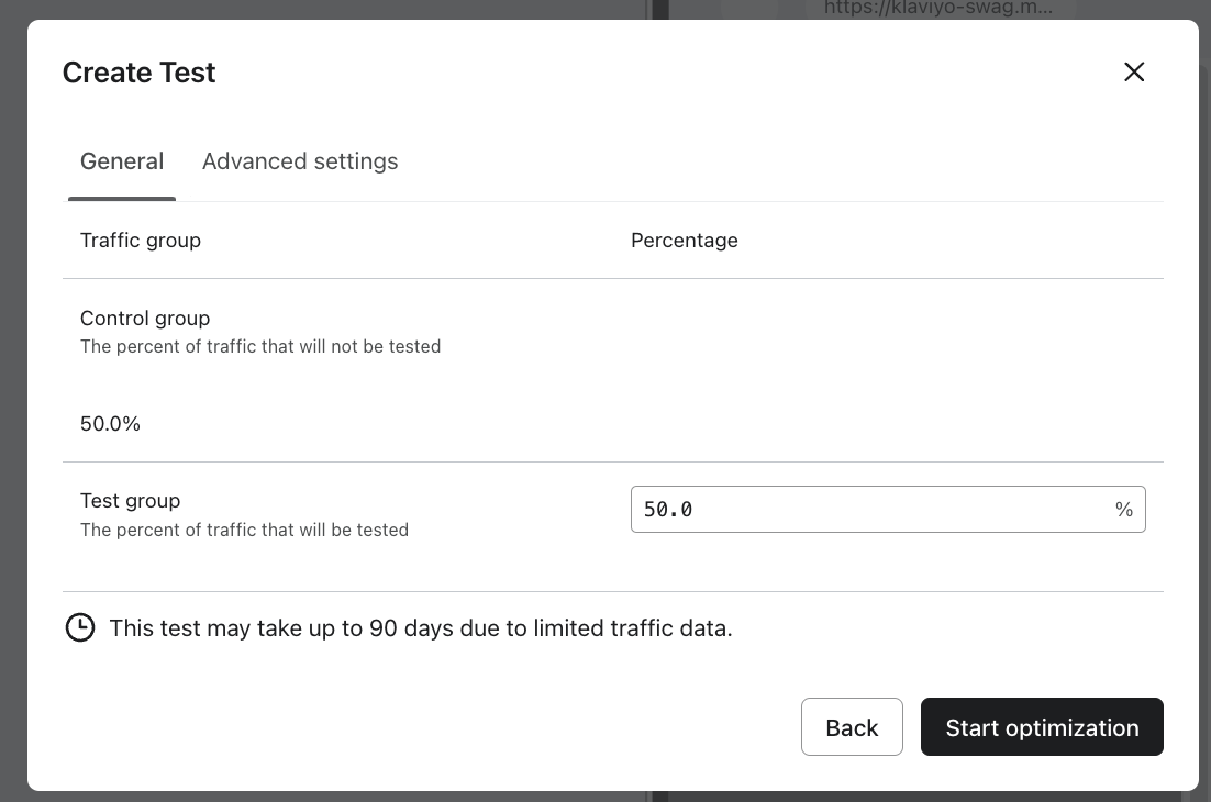 - Om ditt registreringsformulär inte har tillräckligt med trafik visas en uppmaning om att Klaviyo inte rekommenderar att du kör ett optimeringstest på det här formuläret. Vi föreslår att du kör optimeringstester på registreringsformulär med högre trafik för att se de mest exakta resultaten. Om du väljer att köra testet på ett formulär med låg trafik kommer testet att pågå i högst 90 dagar.
