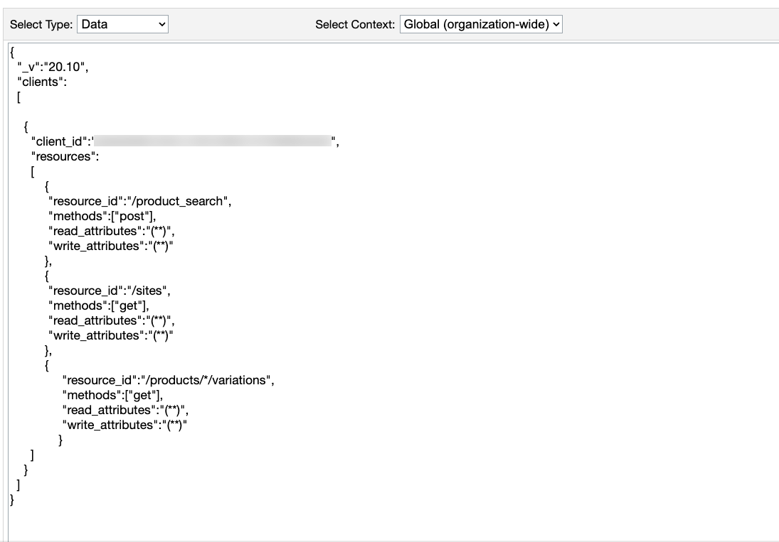 - Lägg till följande JSON som en listad resurs under typen data och kontexten Global (organisationsomfattande), under det client_id som tilldelats Klaviyo (du bör redan ha andra utdrag här):