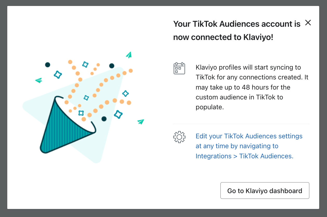 - Du kommer att få ett meddelande om att ditt TikTok Konto är anslutet till Klaviyo.