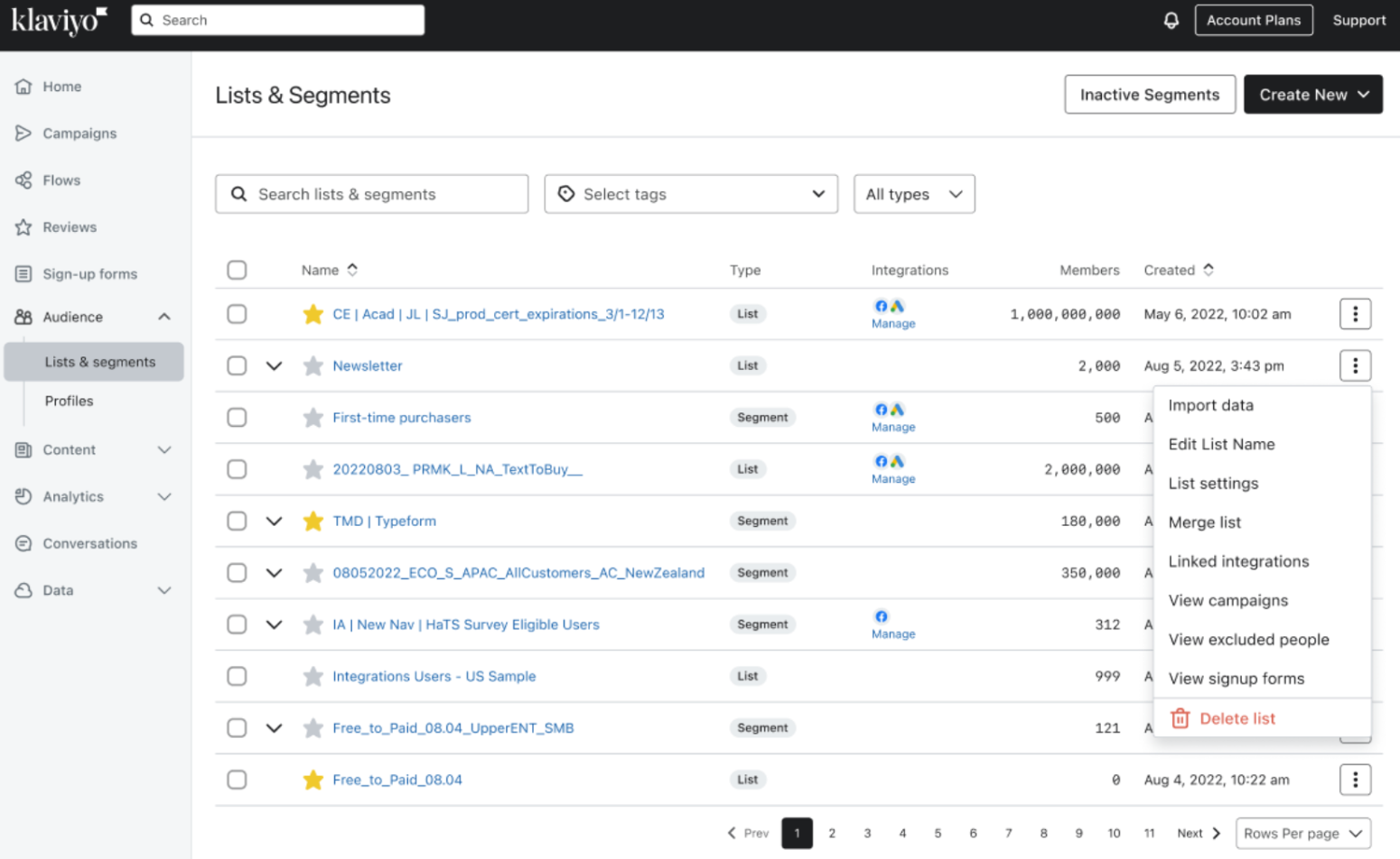 Du kan skapa eller uppdatera TikTok publiksynkronisering (eller synkroniseringar för någon annan annonsplattform) från Klaviyo's lista & segmentfliken.