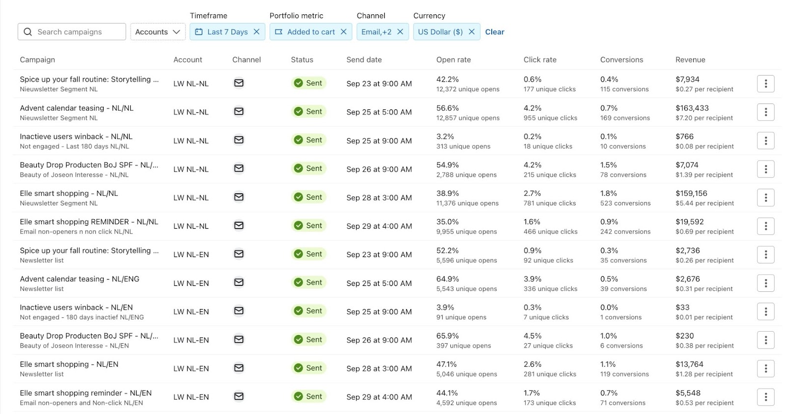 Granska och jämför hur specifika kampanjer eller flöden bidrar till framgång per konto, och jämför aggregerad prestanda utan att behöva logga in på enskilda konton.