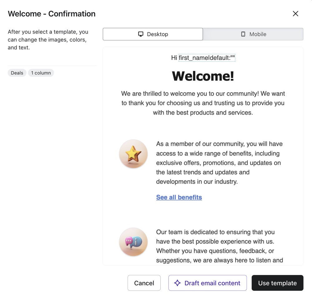 För bästa resultat, välj en färdigbyggd mall från biblioteket eller en mall som du redan har skapat och som innehåller innehåll (t.ex. textblock, knappar, delning, tabeller etc.). Detta ger Klaviyo AI en bättre uppfattning om den struktur och stil du letar efter. köpcentrum som huvudsakligen består av bilder är svårare att utarbeta med hjälp av Klaviyo AI.