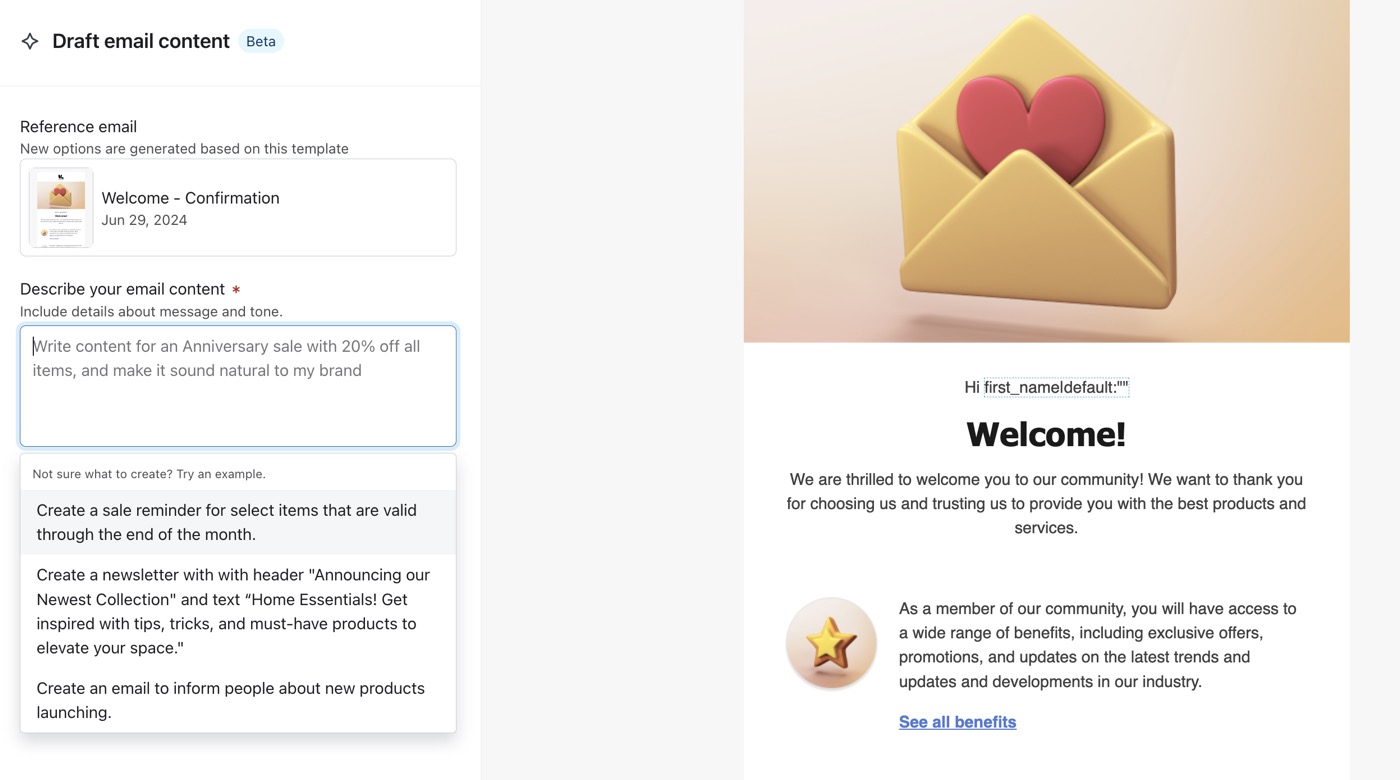 Lär dig hur du använder Klaviyo AI-verktyget för att skapa en artificiell intelligensgenererad kampanj-e-post. Alternativet att skapa innehåll med artificiell intelligens accepterar naturliga språkinmatningar (dvs. normala fraser och meningar) och genererar ett e-postmeddelande baserat på ett referenscenter.