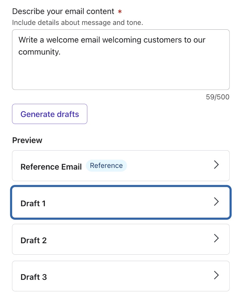 - Om något av utkasten är nära det du vill ha markerar du det och klickar på Öppna i redigeraren uppe till höger för att öppna redigeraren för e-postmallar. Redigera det genererade innehållet efter önskemål.