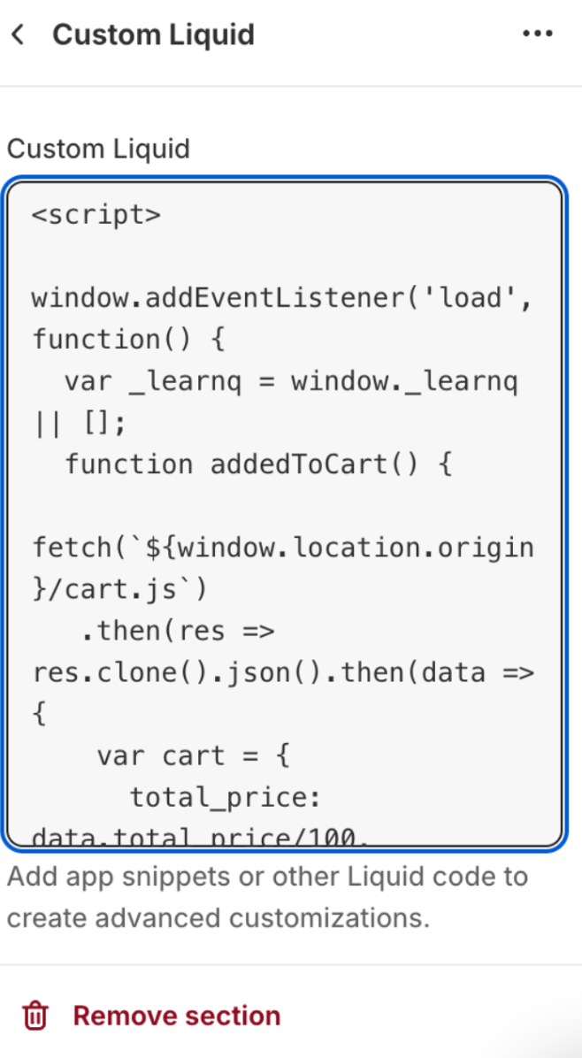 - Hitta den anpassade vätskan block som du använde för din Added to Cart-snippet . Det finns flera kodsnippet som du kan ha använt; leta efter raden