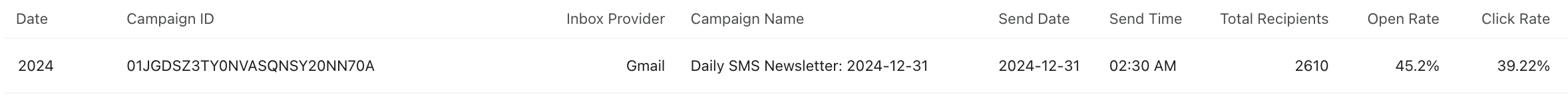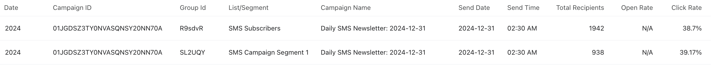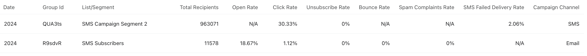 Varje rad i din rapport kommer att visa data per segment (dvs. kampanj-ID) och per kampanj sändning (dvs. kampanj-ID och kampanjnamn), med ytterligare motsvarande rapport mättal. -