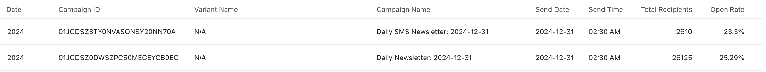 Observera att kampanjer utan variation kommer att visa "N/A" under variationskolumnen.