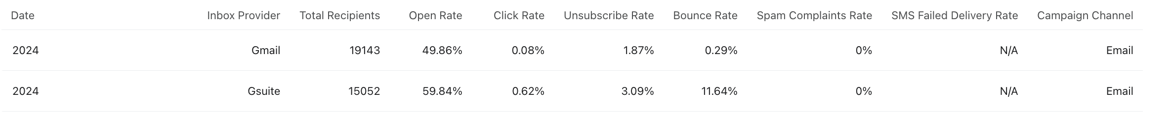 Genom att markera rutorna för både kampanj och inkorgsleverantör skapas en rapport som bryter ner mättal per inkorgsleverantör per kampanj. Varje rad i din datarapport kommer att visa per leverantör av inkorg och per kampanjutskick, med ytterligare leveransbarhet mättal. -
