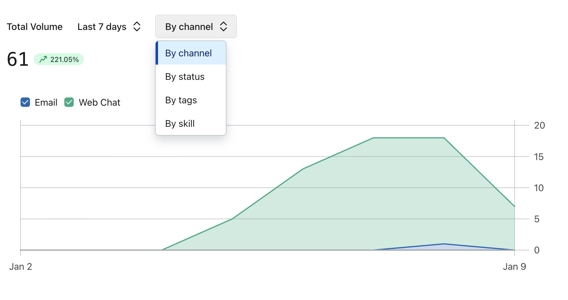 Använd kanalväljaren för att välja hur data i diagrammet ska grupperas. Du kan välja att gruppera data i stapeldiagrammet efter: kanal, status eller etikett.