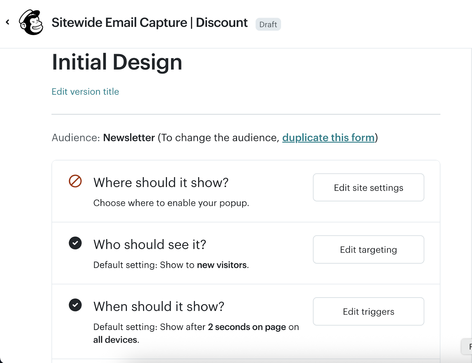 Om du har ett formulär teaser aktiverat i Mailchimp, dokumentera innehållet och utseendet så att du kan återskapa det i Klaviyo. Ta skärmdumpar eller dokumentera på annat sätt: