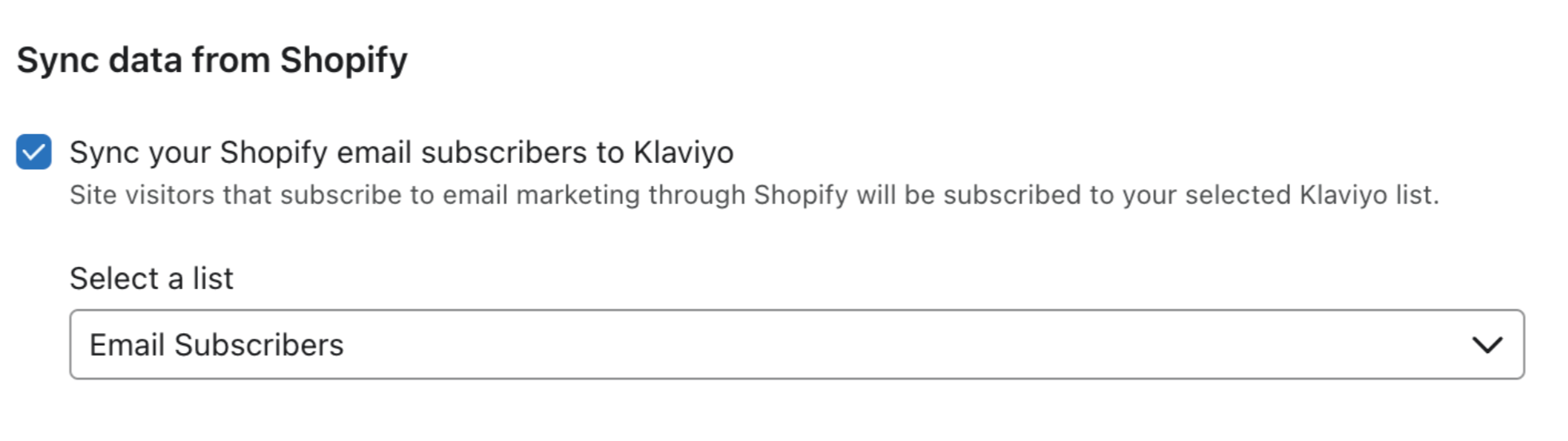 Se till att du har valt en lista som e-post prenumerant ska läggas till i dina Shopify integrationsinställningar (i Klaviyo hittar du den genom att välja fliken integrationer och sedan hitta Shopify på listan och välja den). Inställningen finns under Synkroniseringsinställningar på fliken Från Shopify. Detta är den lista som Konto registrering kund kommer att läggas till, när du lägger till kryssrutan i ditt formulär.