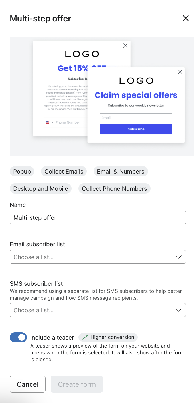 Om du väljer ett flerstegsformulär från formulärbiblioteket kan du välja två olika listor för din nya e-postprenumerant och smsprenumerant att skicka till när de fyller i formuläret. Klaviyo rekommenderar att du använder separata listor för att hjälpa dig att hedra dina kunders föredragna kanal och hålla koll på e-post och sms-listans tillväxt.