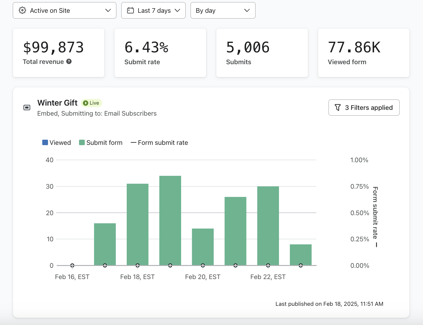 För att se data för en annan tidsram, navigera till klicka på ditt formulär för att se analyssidan. Härifrån kan du justera datumintervallet efter behov. Antalet inlämningar anger det totala antalet formulärinlämningar.