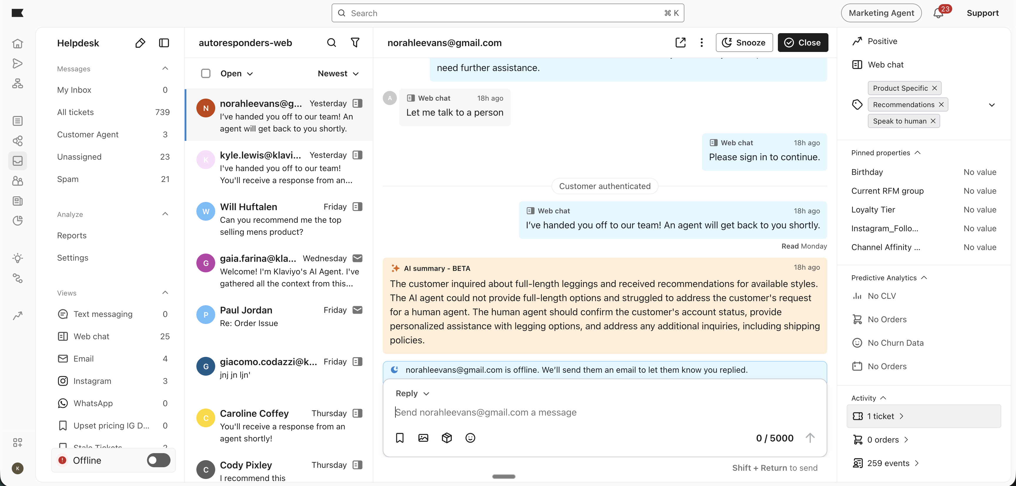 AI-applicerad etikett: För att spara tid analyserar vår AI automatiskt innehållet i tidigare interaktioner och tillämpar beskrivande etikett - t.ex. leverans, orderspårning, rekommendationer eller återbetalning. Dessa etikett gör det möjligt för handläggarna att snabbt se vad ett ärende handlade om utan att behöva läsa igenom gamla trådar.